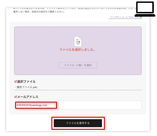 メールアドレスを指定し、「ファイルを復号する」ボタンをクリックします。