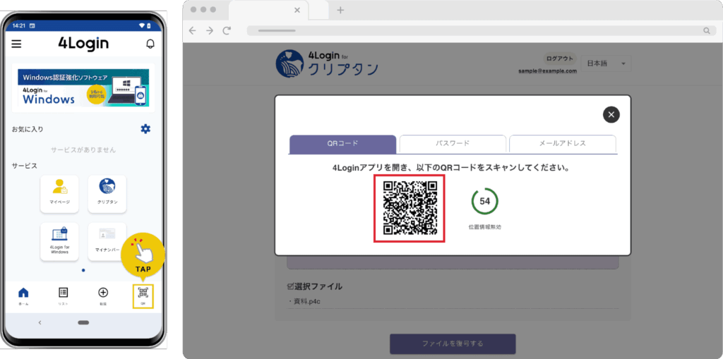 暗号化ファイル(p4cファイル)は、「QRコードの読み取り」「パスワード入力」「メールアドレス入力」の3つの方法で復号できます。ご自身の利用環境に合わせてお進みください。