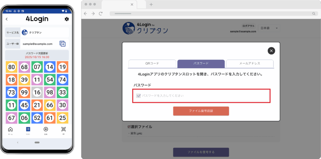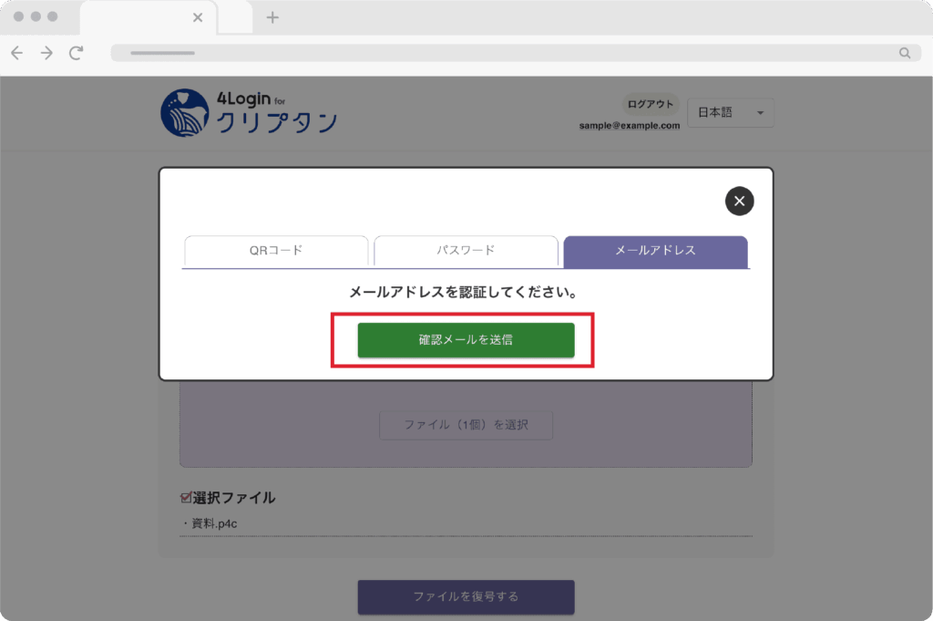 暗号化ファイル(.p4cファイル)をアップロードし、「ファイルを復号する」ボタンをクリックします。