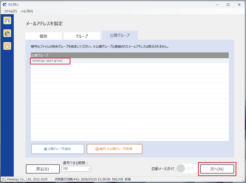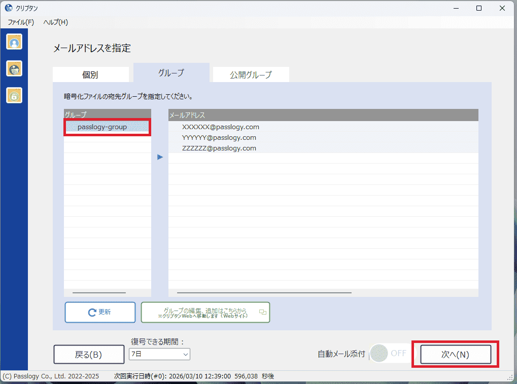 入力が完了したら、グループ名を選択して「次へ」をクリックします。(グループ内のメールアドレスは表示されません。)