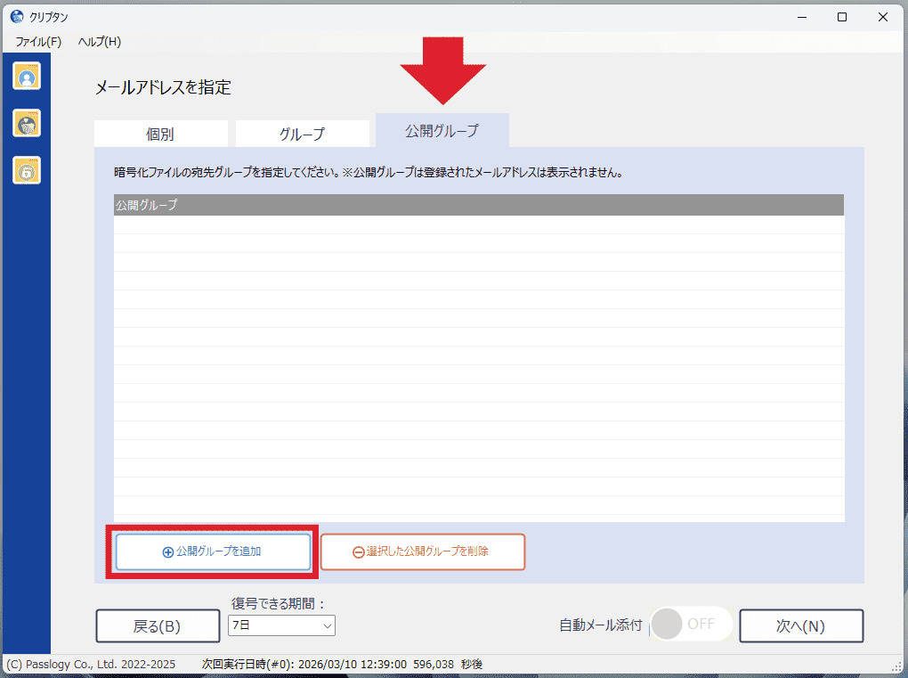 クリプタンDesktopを起動し、暗号化画面から「公開グループ」内の、「公開グループを追加」ボタンをクリックします。